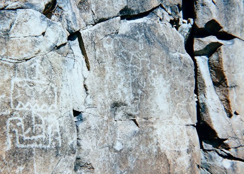 Las Pintas is a large boulder area with petroglyphs dating back 2,000 years and perhaps to 3,000 ago. The art has been added at the site up to mission times, based on the subject matter displayed. It is believed that Las Pintas is the southernmost example of Great Basin Abstract rock art. It contains very little hunting imagery (common at many other sites). Instead there is more religious ritual style art. This tends to indicate Las Pintas was a ceremonial location and not a native village site.