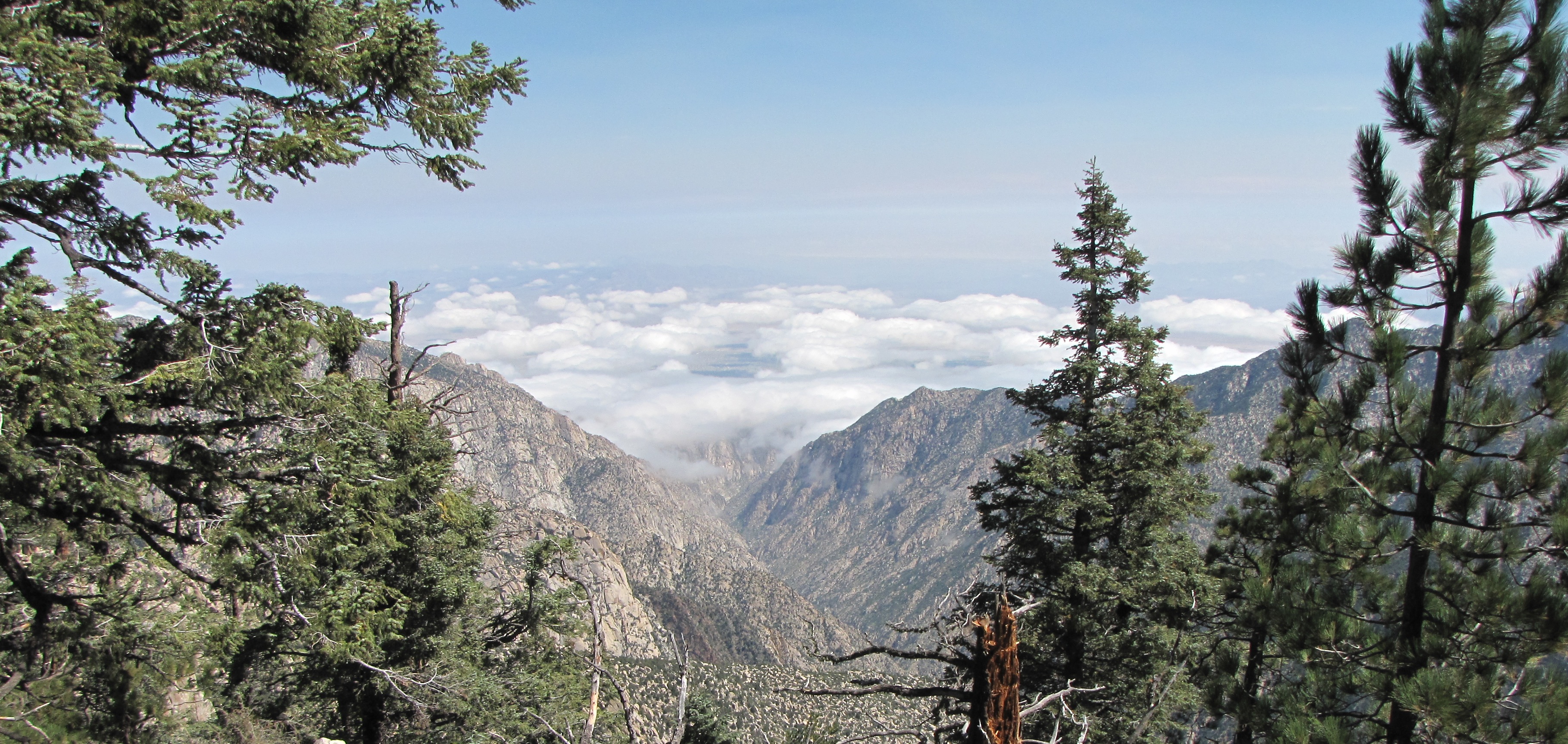 Next day, I led Pili over three miles uphill crossing the abundant streams to stand on top of Observatory Ridge and admire the viewpoint of Picacho and the desert below. The white domes of the telescopes were visible two or three miles to the north. We were in bright sunshine, above the remnants of the clouds fast dissipating below. A brown layer was clearly visible to the north, presumably from a major fire in LA County, whereas the sky to the south was blue and clear.