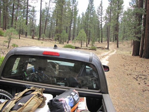For nearly an hour, no vehicle passed. The clouds continued to build. It was now more gray than blue. I was concerned I may need to return to camp or risk getting caught out in a storm with Pili. Then a new Toyota pickup came by, heading to the observatory. The older driver and his wife kindly agreed to take me out to my vehicle and provide a jump. I traveled with Pili in the pickup bed. The Hispanic couple from Escondido were looking increasingly doubtful as we passed sawn trees and diversions.