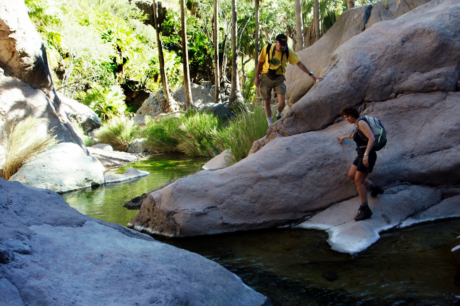 There are several difficulties along the way, and those wishing to continue should be comfortable scrambling up fairly steep rock sections. Ladders and ropes may be in place where a large waterfall stops passage. There are numerous pools and twisting channels cut through the rock. The deep pools that were once a hallmark of this canyon are returning as the stream continues to cut through the debris deposited by the storms of 2013. Above the falls are luxuriant oases of palms and pools. Be sure to look for the cave paintings.