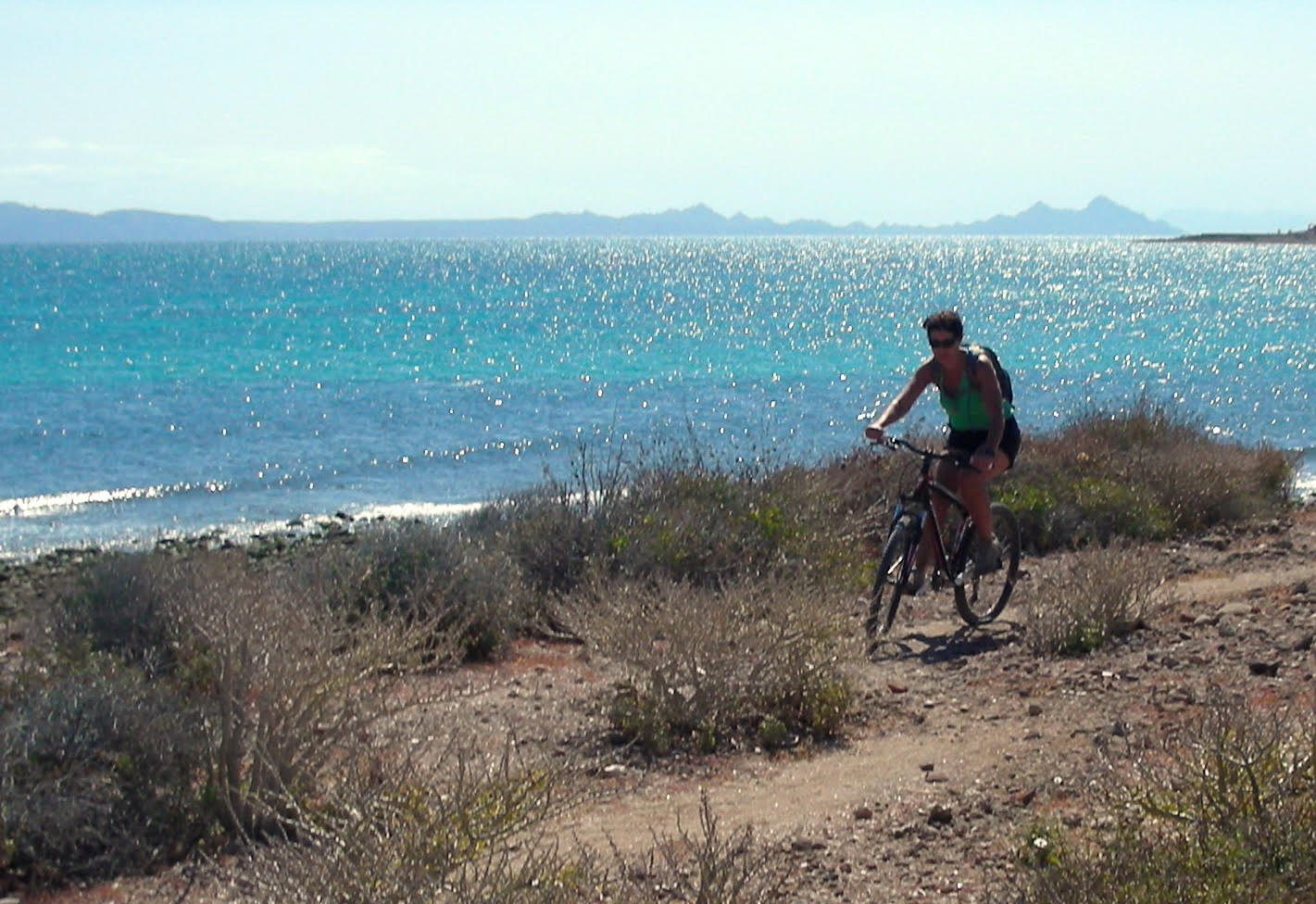 Experienced riders looking for more challenging rides will find several single track trails off of the San Javier road heading west. Ride up the San Javier road for about 3+ kilometers, look for a major dirt road that crosses the pavement (part of the race course). You will see an electric sub station on your right. There are single track trails on both sides of the road. A difficult loop starts on the left. Go through a fence just right of the race course and you will see the start of the trail. Follow this down crossing the dirt road (this downhill is quite steep and can be avoided by going down the race course a short distance and looking for the trail on the left). Follow this fun trail as it winds up and down and around coming back down into a sandy arroyo. Go left in the arroyo for a short distance and look for the trail continuing up to the left. This will wind up and down hills eventually ending up back where you started. On the other side of the paved road is an easier trail that parallels the road heading back down towards Loreto.